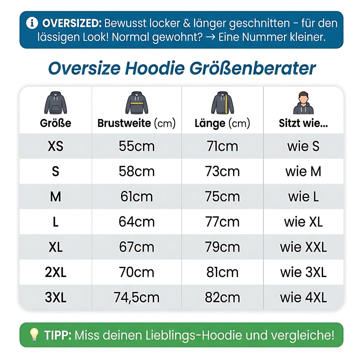 Unsere Schnitte sind normal bis leicht oversized – für extra Komfort im Alltag. Nutze gerne unseren Größenberater auf der Produktseite. Und wenn doch mal etwas nicht passt: Du kannst deine Bestellung ganz einfach zurücksenden und in der richtigen Größe neu bestellen.